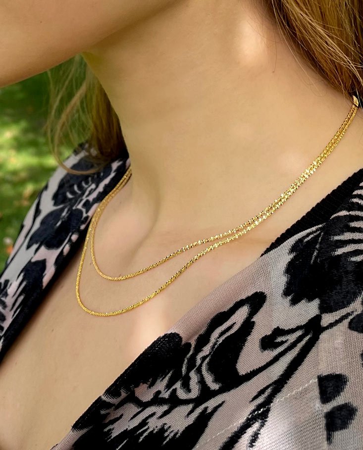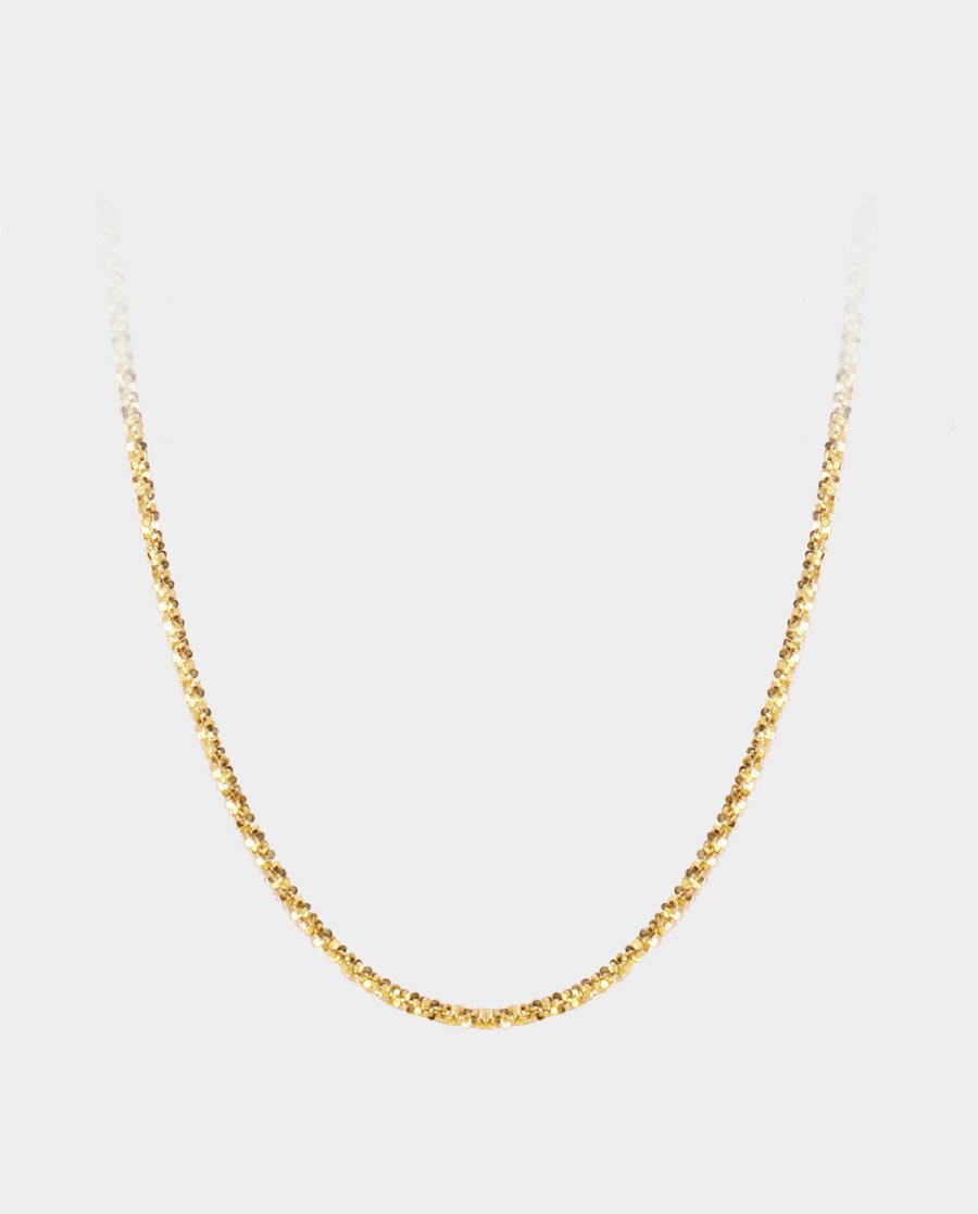 The gold chain is a complete piece of jewelry in itself. Simple and delicate, yet fulfilling the ultimate purpose of a piece of jewelry. The chain links are designed with flat surfaces that reflect the light in all directions. The gold will sparkle and shine like gemstones reflecting ambient light. The chain links are processed according to the characteristic staggered design, giving the necklace its unique twisted look.
