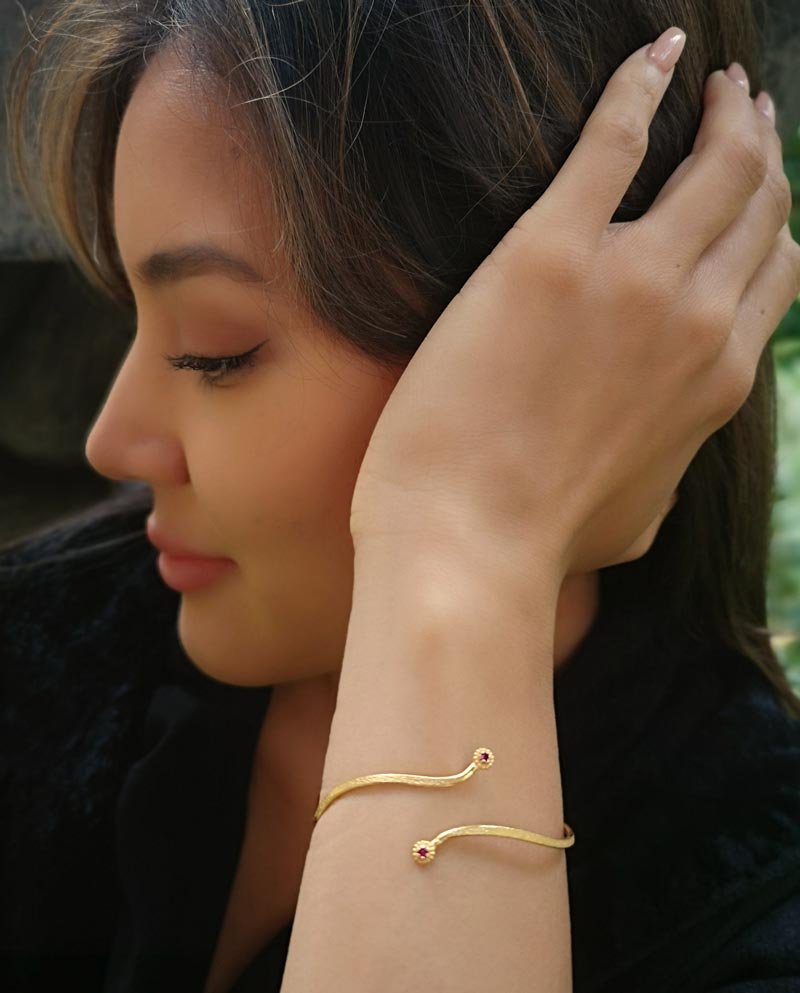 Armbåndet lægger sig organisk om dit håndled. Granaternes placering for enderne underbygger kulørens intensitet. Kurverne er kreeret i hånden, hvilket giver hvert unikke smykke sit eget skulpturelle udtryk.