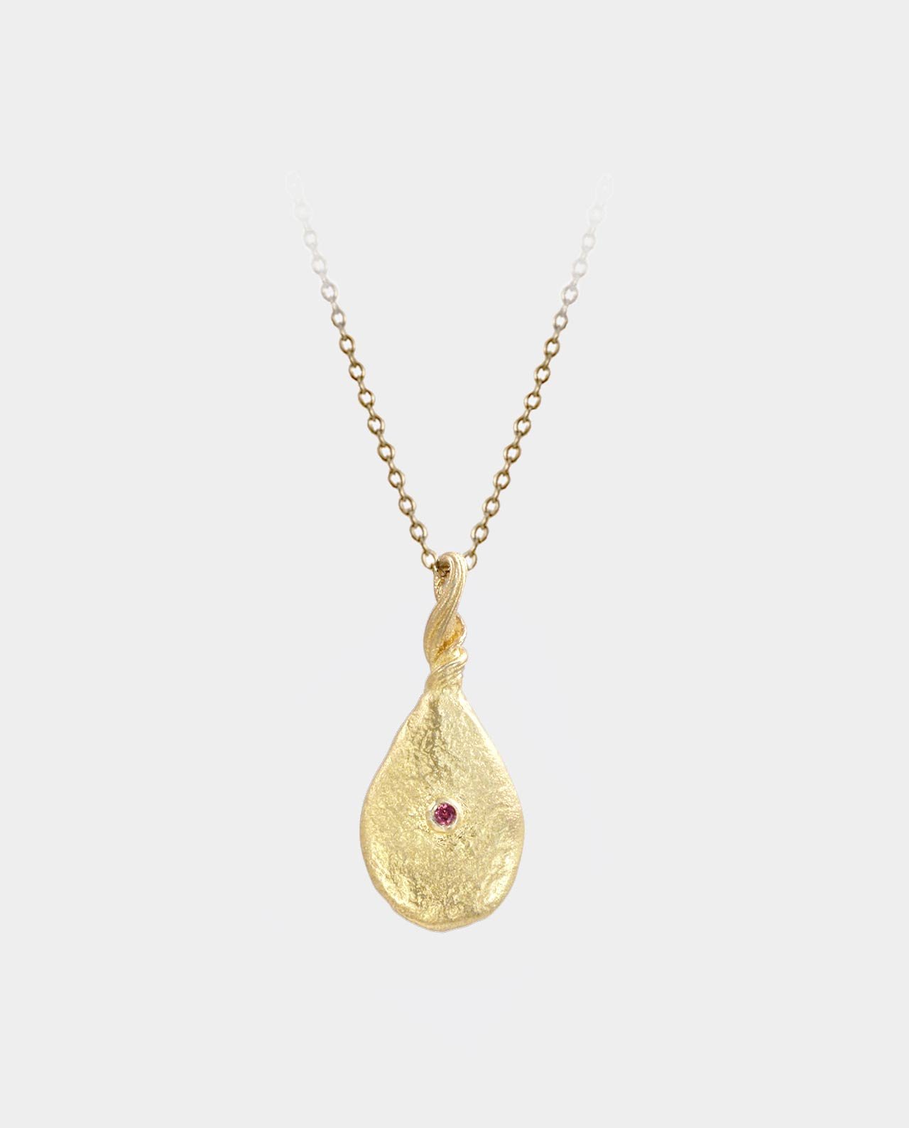 The pendant of the necklace has been a surface treatment that makes it look like something that was found in a treasure chest and has acquired its beautiful patina after thousands of years at the bottom of the sea. The bail is an important part of the design. It is crafted in a way that makes it look like it has been shaped and twisted from the pendant itself. In the center sits a small, adorable pink garnet.