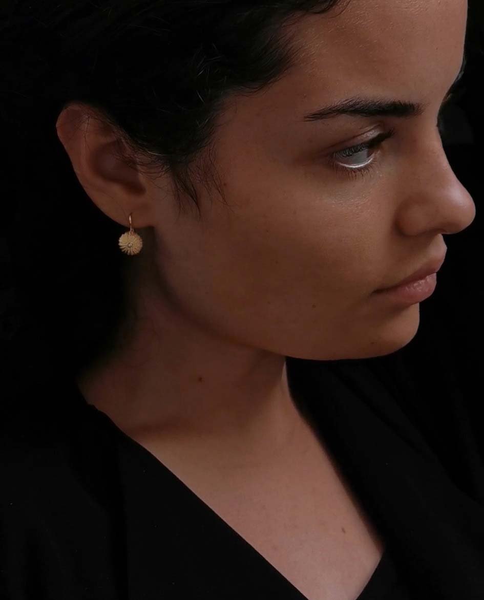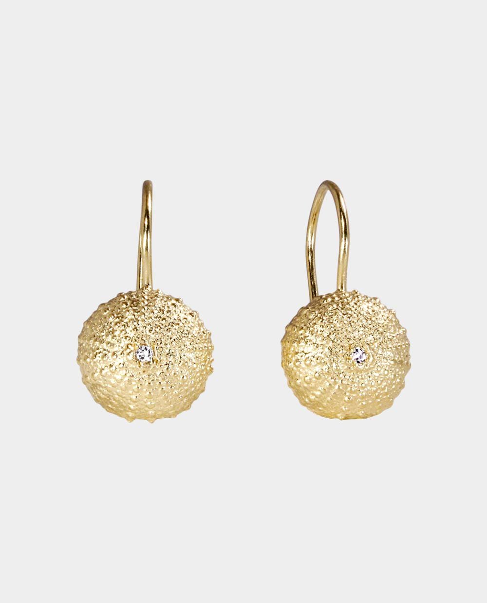The earrings are a one-to-one casting of a sea urchin shell. A good friend of mine gave me this little sea urchin shell, which she found on the west-facing shore of Fanø. By proceeding very carefully, it was possible to make the impression of the sea urchin’s thin markings without breaking it. A small white topaz is placed In the center.
