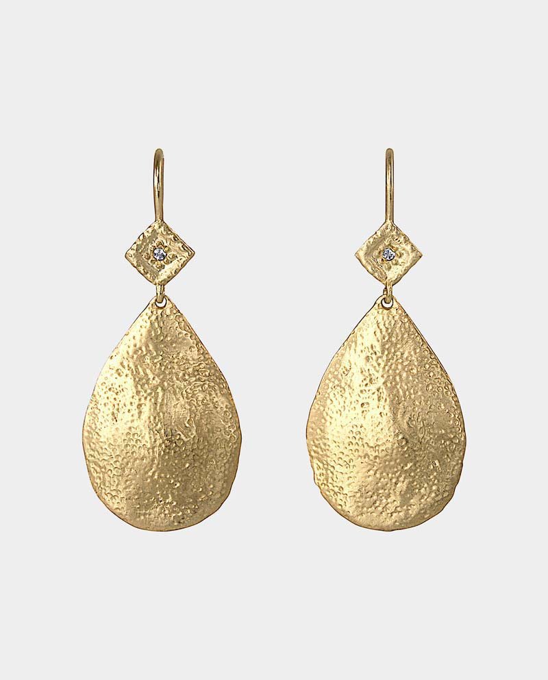 Samspillet mellem øreringenes dråbeform og let konvekse overflade tilfører smykkets genskin en særegen blød rytme. Alt imens foranlediger øreringenes nubrede overflade ganske små kontraster imellem mørke og lys – netop dét, der fanger betragterens opmærksomhed.