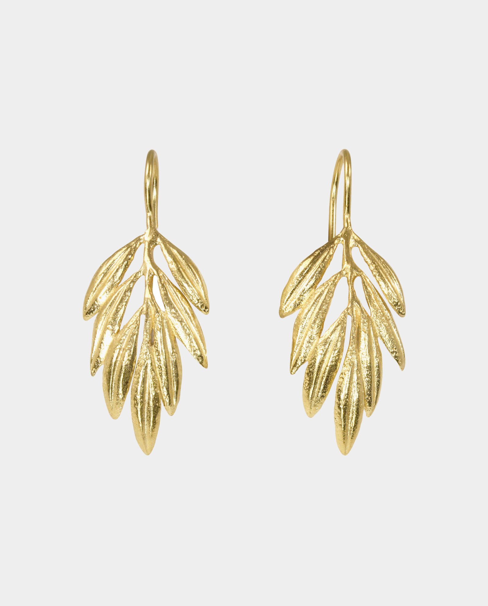 Øreringene gengiver en miniature olivengren. Ideen med designet har været at komme så tæt på virkeligheden som mulig. Læg mærke til den organiske balance imellem det enkelte blads runding i samspil med grenens bue som helhed. Med sin krøllede stamme og støvgrønne blade er oliventræet min favorit blandt Middelhavslandenes vegetationer.